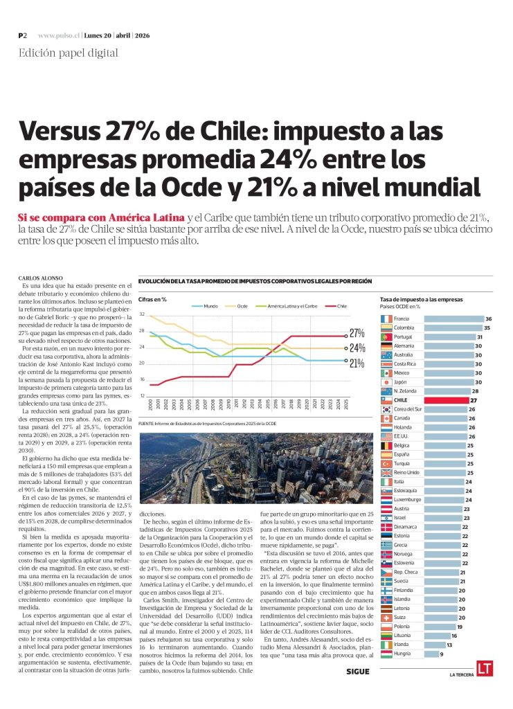 abril 20 Creado por: MAyA Editor Posted In: Sin categoría Date: 20 de abril de 2026 0 6 Versus 27% de Chile: impuesto a las empresas promedia 24% entre los países de la Ocde y 21% a nivel mundial La Tercera – 20 de abril 2026 Share This Article : Previous Post Hacienda anuncia eliminación del IVA a la vivienda por un año para acelerar las ventas